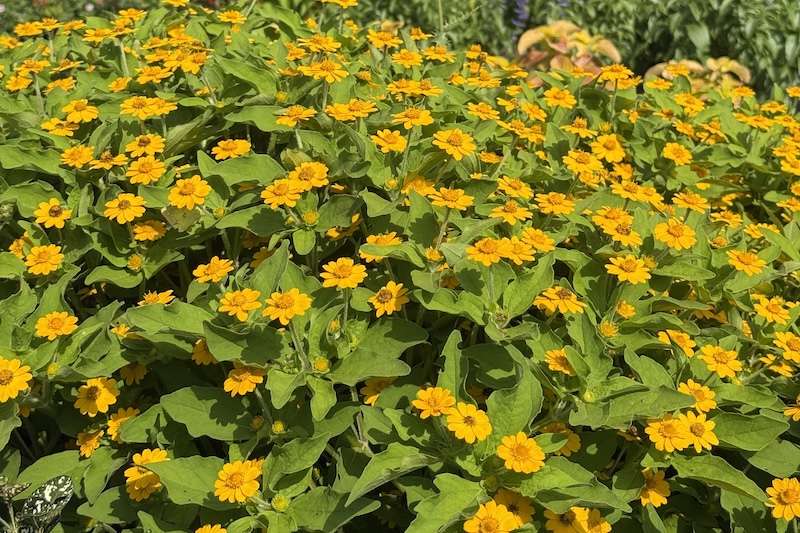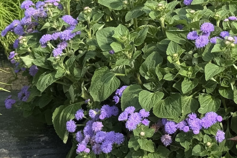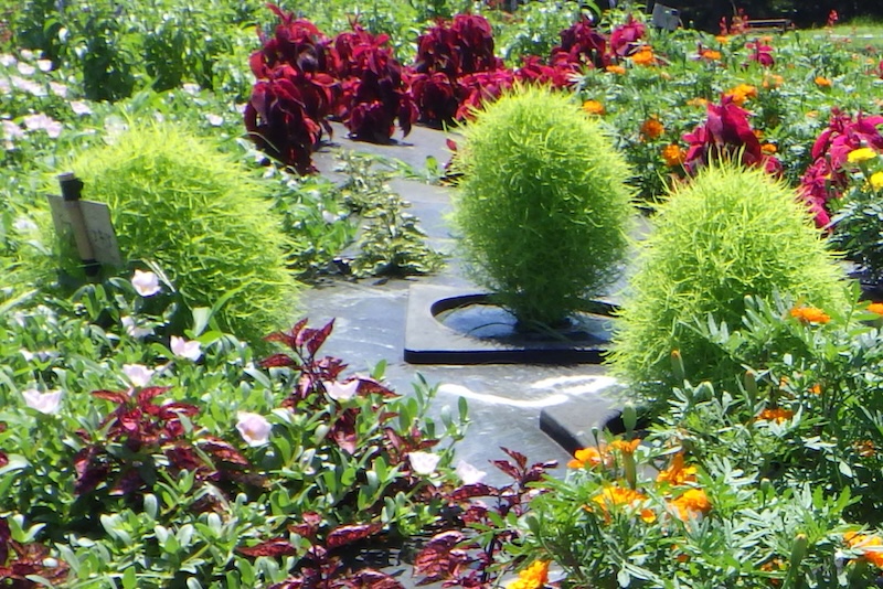 太陽の光を浴びて元気に咲き誇る黄色の小花「メランポジウム」や、涼し気な雰囲気を添える、ふわふわとした青色・白色の「アゲラタム」は今年のおすすめ品種となっています。また、紅葉せずにみずみずしい“ライムグリーン”を保つ「コキア“ホワイト”」は、10月にコキアが紅葉を迎えた時期でもひときわ目を引きます。それぞれの品種の色や形の違いを近くで観察することで、植栽の工夫や季節の変化も感じられるガーデンです。