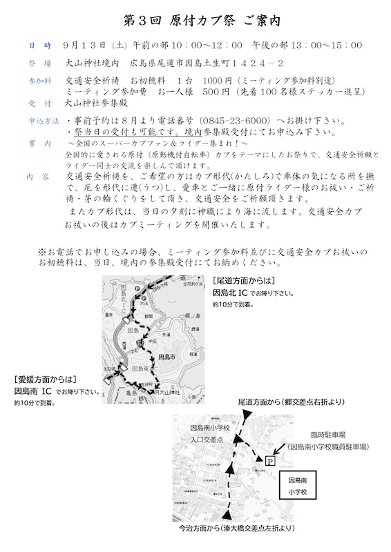 全国的に愛される原付カブをテーマにしたお祭りで、交通安全祈願とライダー同士の交流を楽しんでいただけます。