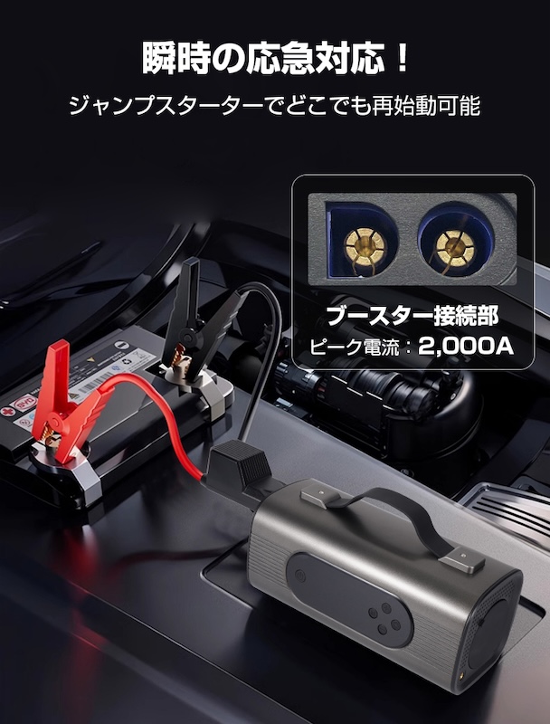 最大2000Aの強力電流で、真冬のマイナス気温やバッテリーが著しく弱った状態でも一発始動!「かからない…」というストレスから解放されます