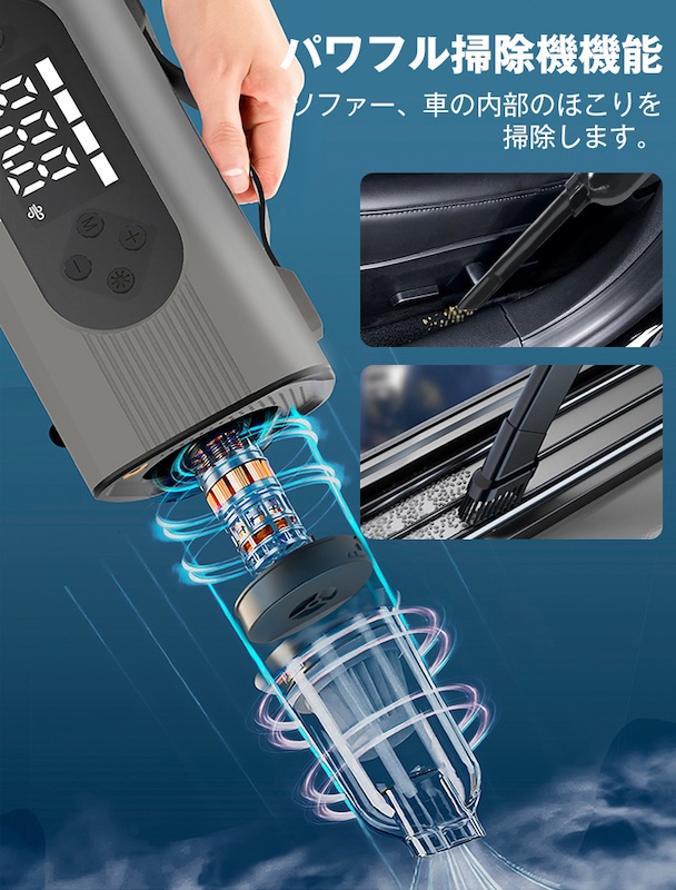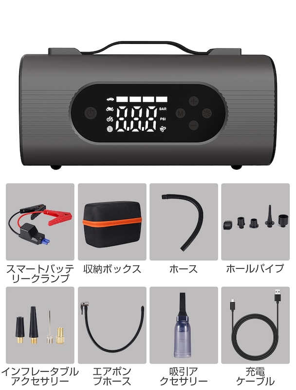 本製品はジャンプスターターだけでなく、空気入れ・空気圧チェック・LEDライト・モバイルバッテリー・掃除機・ブロワー・空気吸引機能を兼ね備えた8in1マルチデバイスです。まさに、クルマとアウトドア愛好者にとって「持ち運べる安心セット」と言えるでしょう。