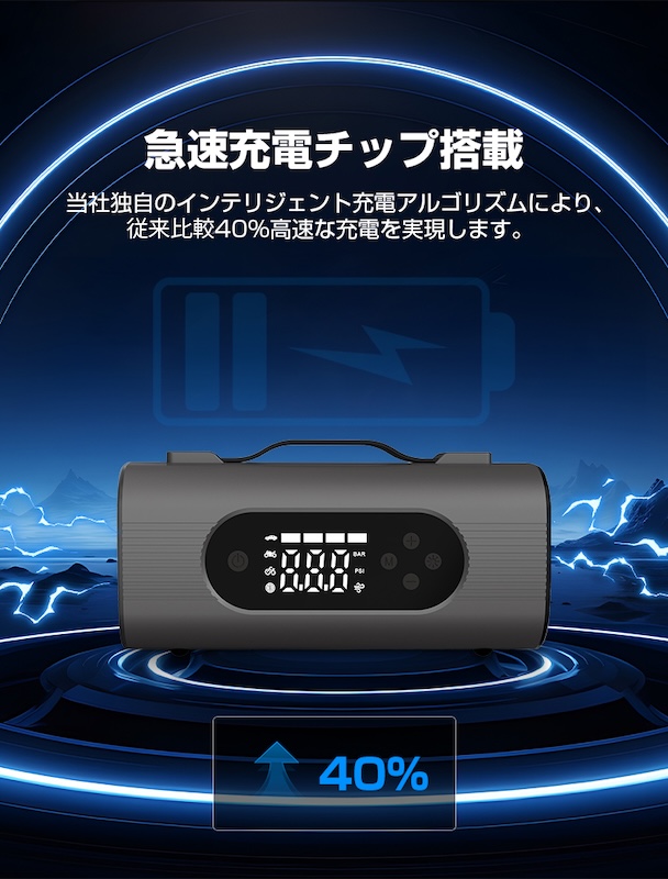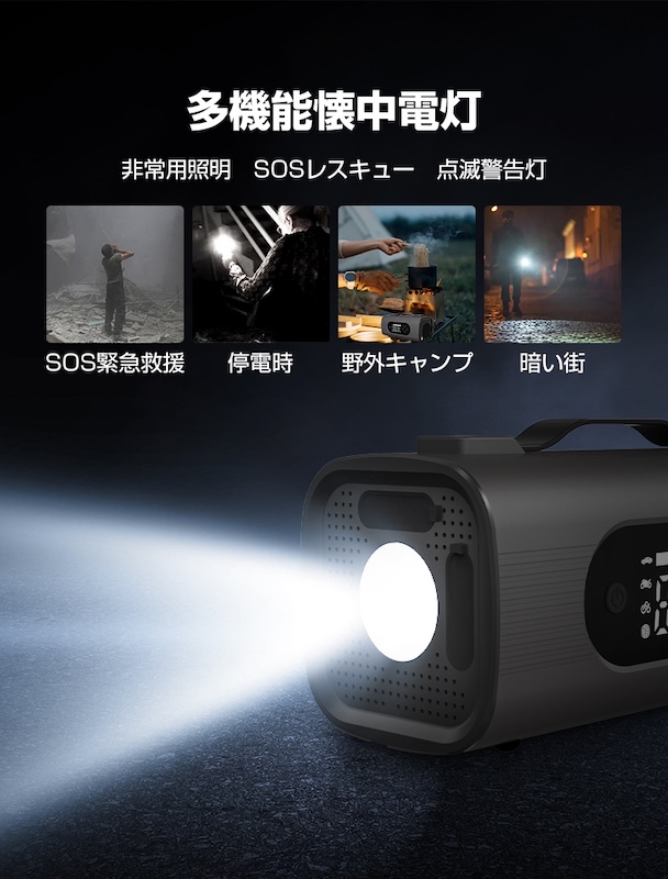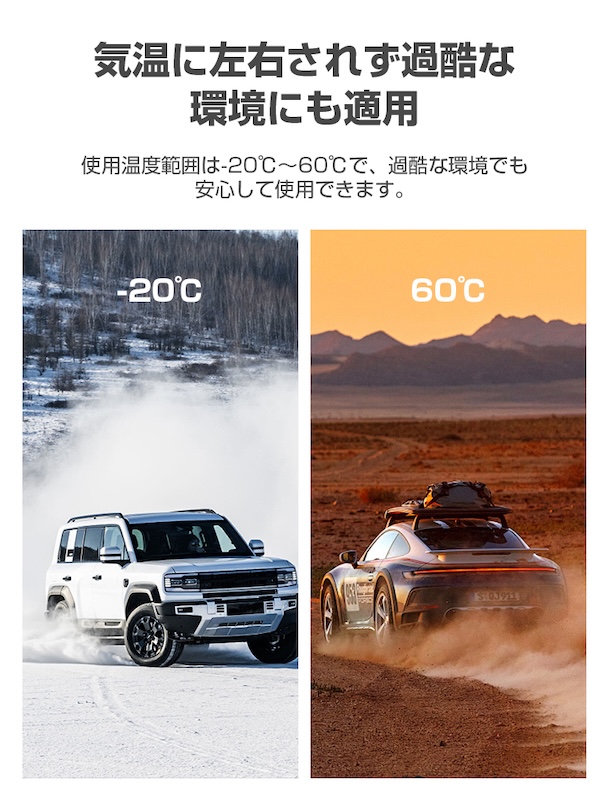 高性能リチウムイオンバッテリーで長時間の使用が可能。自己放電率が低いため、長期保管後でもすぐに使える安心設計。長距離ドライブや災害時の備えにも最適です。