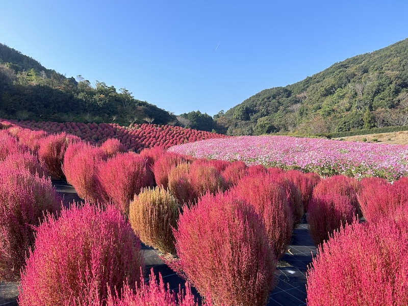 約9,000㎡の緩やかな斜面には、春はネモフィラ、夏はヒマワリ、そして秋にはコスモスと鮮やかに色づくコキアの共演が楽しめます。特に秋は、深紅のコキアとコスモスが織りなす美しいコントラストが、訪れる人々を魅了します。