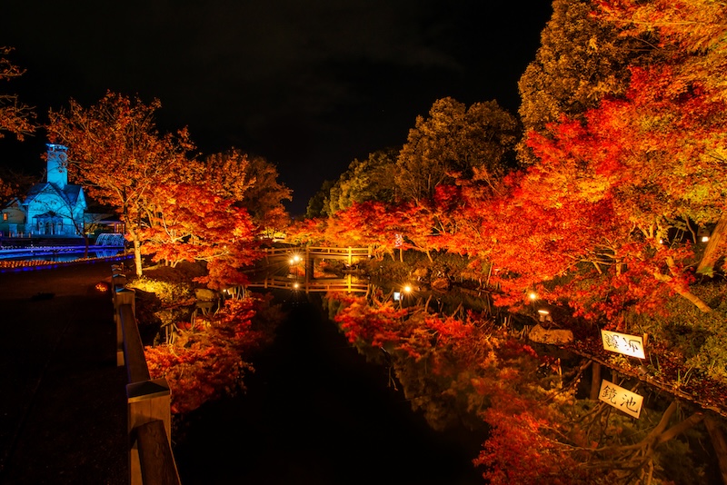 また日没後のライトアップされた紅葉が美しいことでも有名で、特に注目スポットの鏡池は、イロハモミジなど、赤と黄色で鮮やかに彩られた紅葉をお楽しみいただけます。