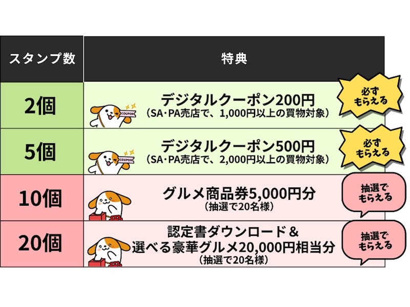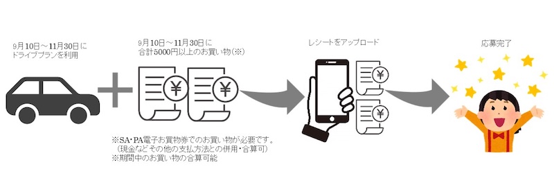 期間中に、SA・PA電子お買物券付速旅ドライブプランをご利用のうえ、SA・PA電子お買物券利用を使用して合計5,000円(税込)以上のお買い物をし、そのレシートを撮影して応募いただいたお客さまの中から、抽選で最大2万円分のお買物券などが当たります。