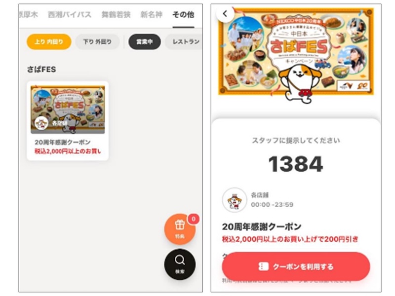 20周年の感謝を込めて、NEXCO中日本公式アプリ「わくわくハイウェイ」で、2,000円(税込)以上のお買い物に使える「200円クーポン」をプレゼントします。
