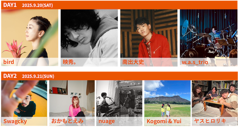 “THE FIRST TAKE”出演経験を持つ「bird」や、「映秀。」「南出大史」「Swagcky」「おかもとえみ」など実力派アーティストが集結。プロフェッショナルなライブパフォーマンスに加え、地元アーティストによる魅力あふれる楽曲も披露。ジャンルを超えた多彩なアーティストによるライブステージを展開します。