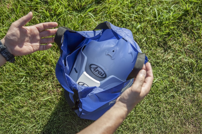 ツーリング先でのヘルメットの持ち運びのために、ポケットへ忍ばせておくのに最適な小さく折りたためるヘルメット・トートバッグ。