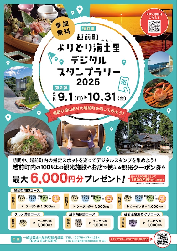 好評を受け、第2弾を9月1日(月)から開始し、福井県越前町内の約50のスポット(※期間限定スポットなど含む)に設置したデジタルスタンプを集めると、集めた数に応じて、越前町内の100以上の店舗や施設で利用できる「観光クーポン券」がもらえます。