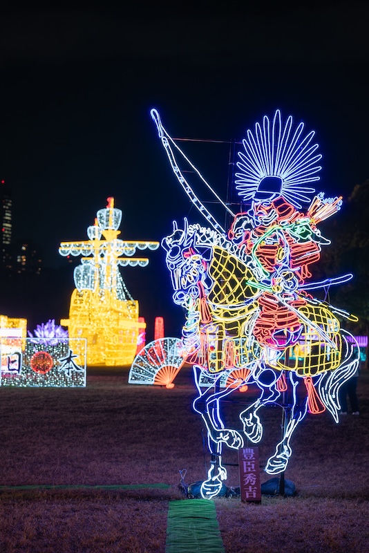 ご好評をいただいている兜コレクションはさらに進化し、全身甲冑に身を包んだ侍たちの立体イルミネーションシリーズとして継続展示。力強くも美しいその姿が、幻想的な光の中に浮かび上がります。