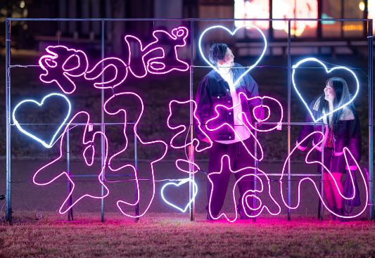 昨年人気だった「アイストンネル」が進化し、今年はピンク色に輝くハート型トンネルとして登場。アーチ状に連なる光は、歩くたびに色合いや輝きが変化し、まるで光の花園を進んでいるよう。歩くごとに色合いが変化し、幻想的な写真映えスポットに。