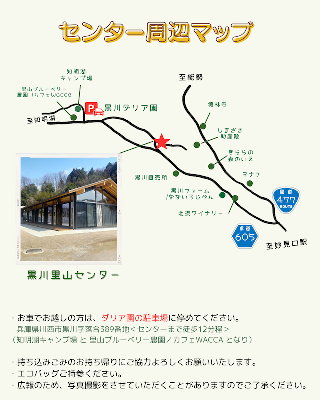 住所:兵庫県川西市黒川字落合389番地(知明湖キャンプ場/里山ブルーベリー農園 / 農園カフェWaccaとなり)