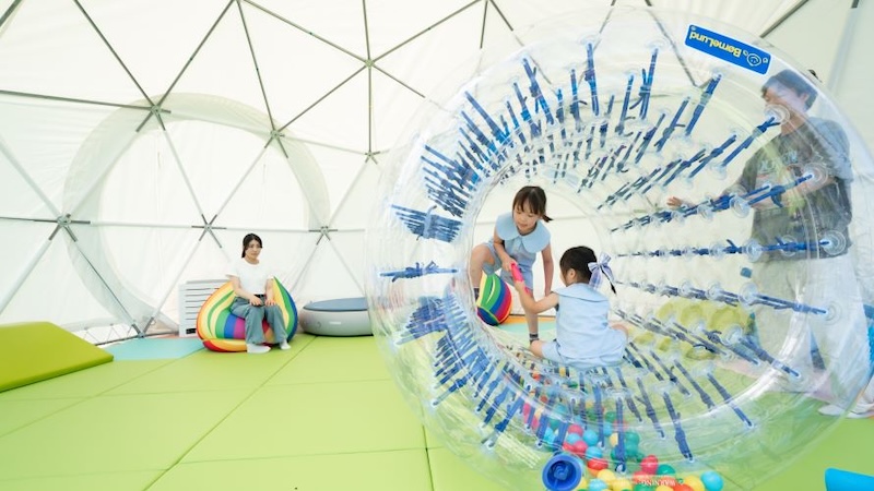40㎡の大型ドームテント2基(エアコン付き)。お子さまが安全に遊べるアイテムを2つに分けた(知育と運動をテーマ)ドームテントです。