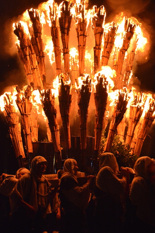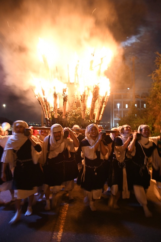 凄まじい炎を巻き上げる100本ほどの松明を立てた御輿を僧兵装束に身を包んだ男たちが担ぎ、湯の山温泉街約2キロを練り歩く光景は圧巻です。