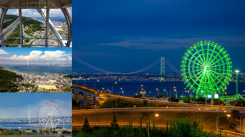 「大観覧車」は、最高65mの高さから明石海峡大橋や瀬戸内海を一望できる絶景スポットで、空と海がつながるような開放感が魅力です。冷房完備の全40台のゴンドラには、椅子も床も透明なシースルーなタイプから、ペット同伴や車椅子対応のものまでそろっています。特に夕暮れ時は、海と橋のコントラストが美しくおすすめです。