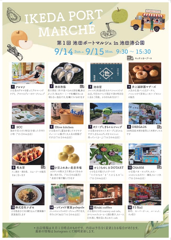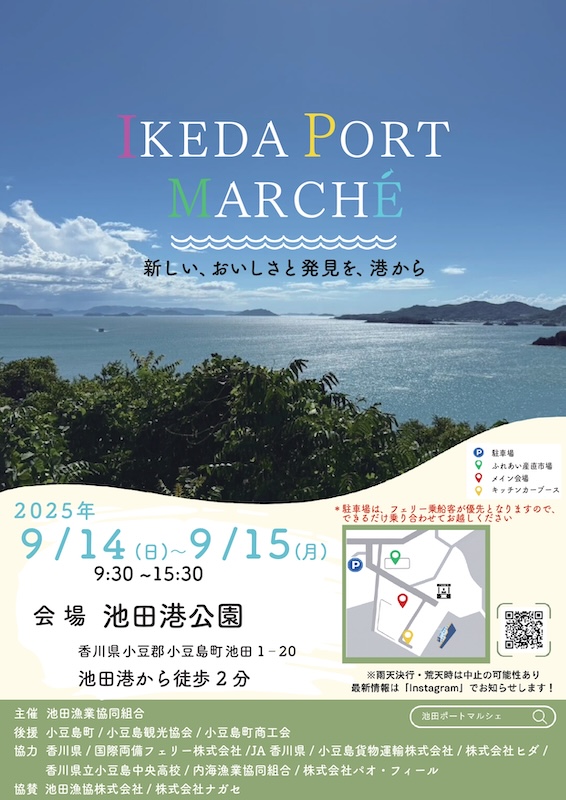 小豆島町の池田漁業協同組合は、2025年9月14日(日)・15日(月・祝)、池田港公園にて「IKEDA PORT MARCHÉ(イケダポートマルシェ)」を初開催いたします。