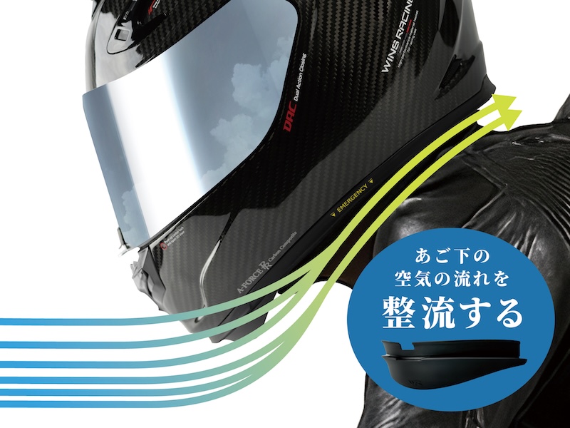 顎下で発生する乱流を抑え、顎や首元への風の巻き込みやヘルメットの浮き上がりを軽減、静粛性が向上。