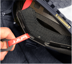 エマージェンシーリリースシステムが搭載されており、万一の時にも、頸椎に負担をかけることなく第三者が頭部からヘルメットを外すことができます。