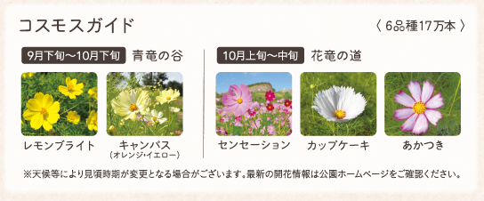 9月上旬ごろから10月下旬まで、6品種計17万本のコスモスがバトンをつなぐように開花します。