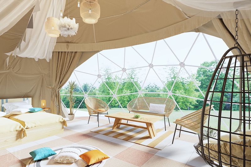アウトドアならではの開放感と快適さを兼ね備えたドームテントは、可愛らしいインテリアで写真映えも抜群。室内には冷暖房や冷蔵庫を完備しており、自然に包まれながらも快適に過ごせる非日常のグランピング体験をお楽しみいただけます。