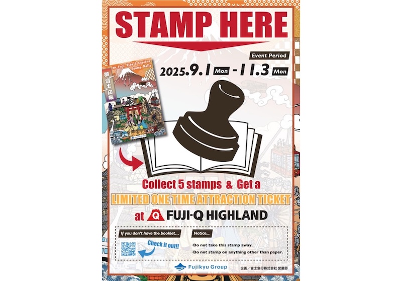 富士急行線の駅および周遊バス沿線の観光・学習関連施設 計24ヶ所を対象として、本キャンペーンオリジナルの御朱印風スタンプが登場。以下の対象周遊チケット購入いただいた方、先着5,000名にプレゼントされる専用の御朱印帳風冊子に5ヶ所以上のスタンプ(御“富士”印)を集め、富士急ハイランドに来園することで機種限定のアトラクション1回券が貰える期間限定イベント。※参加冊子は英語表記。国内在住者も参加可。