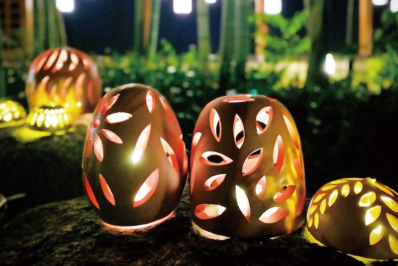 竹林散策庭園にて、陶あかりや備前焼灯篭が夜の竹林庭園に優しくあかりを灯します。