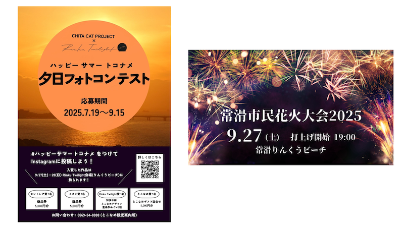 「Rinku Twilight」は2024年に初開催され、大きな反響を呼びました。2年目となる今年は、特別連携企画として、9月27日(土)19時から同会場で「常滑市民花火大会」を実施します。また、「ハッピーサマートコナメ 夕日フォトコンテスト」入賞作品の発表・展示も行います。イベント期間中は「ツーリズムEXPOジャパン2025」会場であるAichi Sky Expo(愛知県国際展示場)からの来場者に向けたプロモーションも展開し、常滑の魅力を広く発信します。
