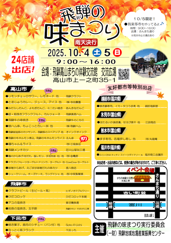 10月4日(土)・5日(日)の2日間、岐阜県高山市にて「2025秋 飛騨の味まつり」を開催いたします。昭和61年から続く本イベントは今年で40年目を迎え、飛騨地域の美味しい食材とグルメが一堂に会する秋の風物詩として多くの観光客や地元の方々に愛され続けています。