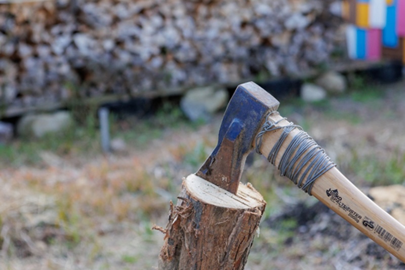 能登島山守の会による薪割り体験では、実際に斧を使って薪を割るダイナミックな体験ができます。割った薪はそのままキャンプサイトへ持ち帰り可能。さらに、Weランドオリジナルのバトニング台(革ハンドル付き)もその場でオーダー&販売されます。