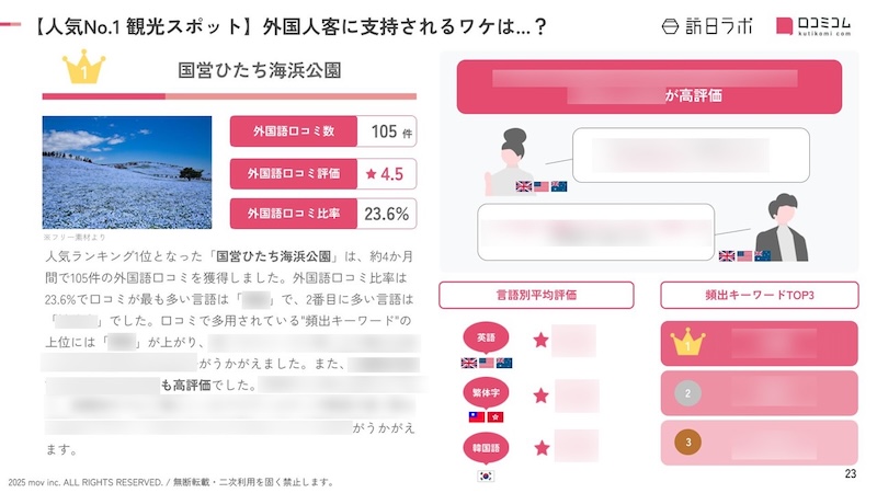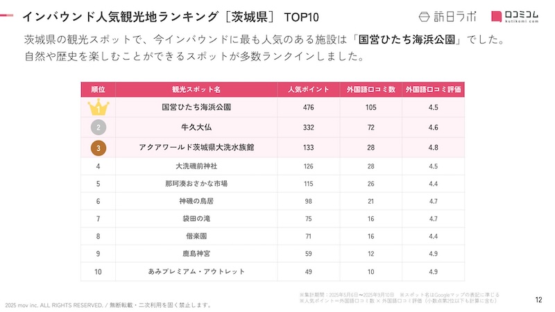 業界最大級のインバウンドビジネスメディア「訪日ラボ」及び 店舗向け集客一元化プラットフォーム「口コミコム」を運営する株式会社movは、茨城県の観光地に寄せられた最新の口コミデータから、独自の『インバウンド人気観光地ランキング』を発表しました。