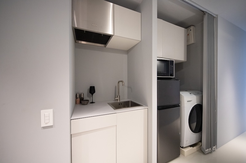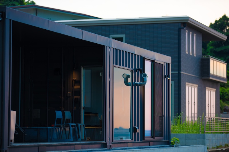 約44㎡で最大6名まで宿泊可能なコンテナ型ヴィラ。ベッド4台とソファーベッドを備え、人数やスタイルに合わせて柔軟に利用できます。洗濯機や冷蔵庫などの設備も完備し、アメニティには品質に定評のある製品を採用しました。