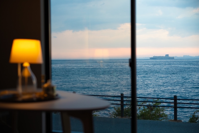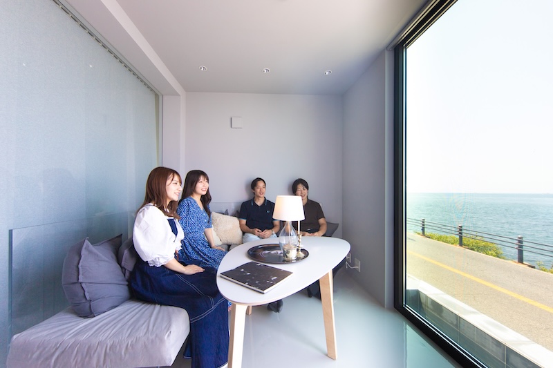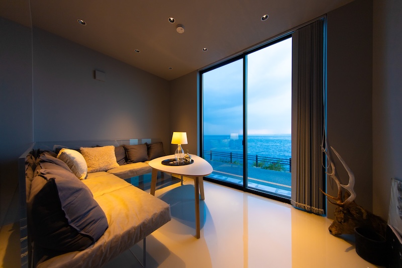 客室一面を覆うガラス窓が視界を海へと解き放ち、反射光が室内に水紋を描きます。アクリル製のベッドやプラモ家具など、素材と透明感にこだわったインテリアは、住まいでありながらギャラリーのような静けさを湛えます。オーナーが選んだアートとアートブックも滞在の余韻を彩ります。