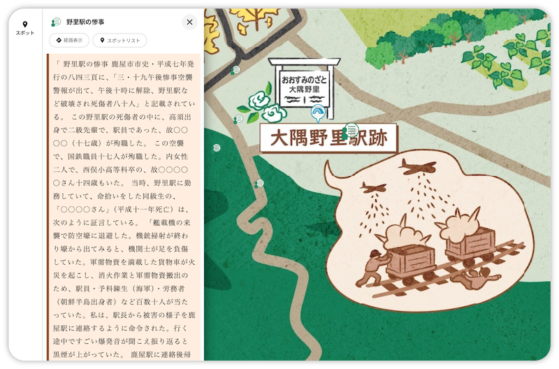 また、Strolyのスポット情報機能を使って、鹿屋市が制作した冊子「永遠の平和を願って―戦争体験談集―」(鹿屋市平和学習ガイド・調査員連絡会)に収められている証言を「エピソード」として挿入。“スポット”と“エピソード”をリンクさせ、市内の戦跡で実際に何が起こったか、何があったかを記しています。