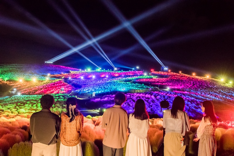 国営ひたち海浜公園(茨城県ひたちなか市)では、9月12日(金)から夜間限定イベント「コキアライトアップ2025」が開催中。約4万本のコキアを舞台に、カラフルなライトアップやレーザービームによる演出、光のドームなど、新たなプログラムが加わり、幻想的な夜を創出します。本イベントは、9月23日(火・祝)までの12日間限定開催となります。