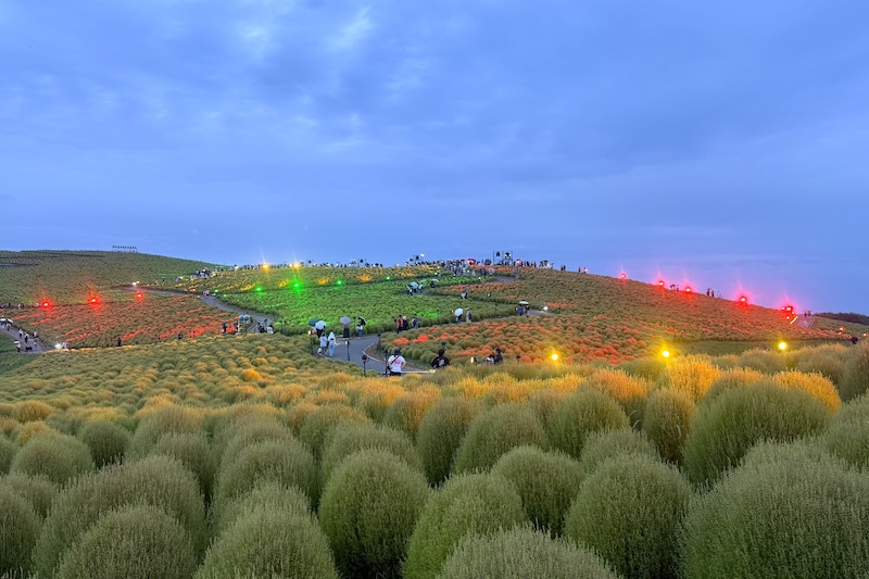 夕暮れ時には、夜とはひと味違う趣をお楽しみいただけます。コキアのくすんだグリーンとライトアップの繊細な光が溶け合うトワイライトの時間帯は、特に見逃せない瞬間です。この時間帯は比較的ゆったりと鑑賞いただけます。