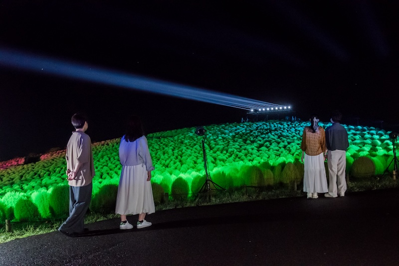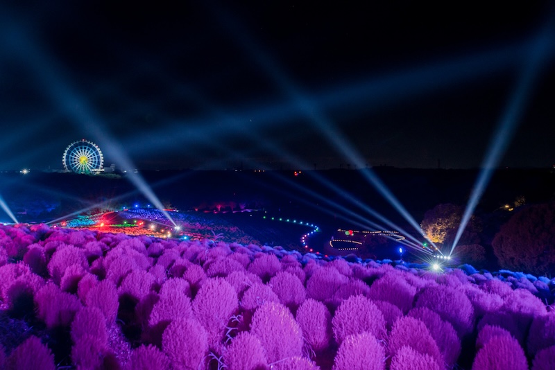 メイン会場「みはらしの丘」には、LEDライト358台とムービングライト34台を導入し、昨年よりも合計で23台増えています。約4万本のコキアが煌めき、壮大な美しさを見せます。ボリュームアップしたムービングライトが夜空に光を放ち、これまでにない迫力を体感いただけます。