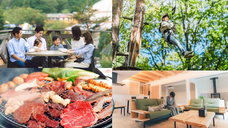 北関東最大級の遊園地「那須ハイランドパーク」のオフィシャルホテルで、那須ハイランドパークや、日本最大級のアスレチック「那須の森の空中アスレチック『NOZARU』」やキャンプ場が併設された宿泊施設です。露天風呂やサウナ、プライベートドッグランが併設された一棟貸し別荘や、温泉露天風呂付きコテージ、日本で初導入した透明なグランピング「AURA」など多様な客室を備えており、「何度来ても楽しめる思い出が積み重なる場所」として、自然と一体となる宿泊体験をご提供しております。