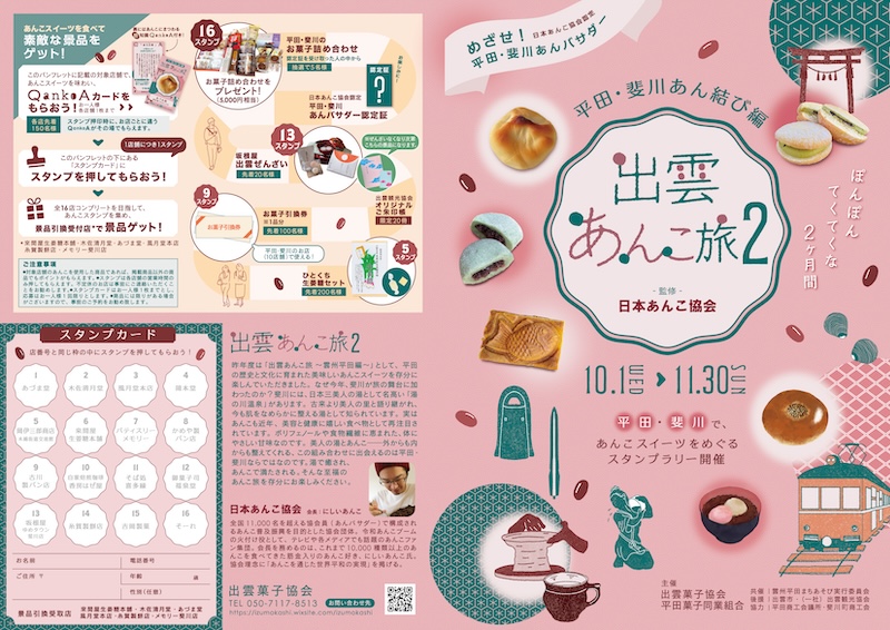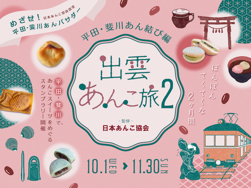 日本あんこ協会は2025年10月1日(水)から島根県出雲市で第2回目の開催となる16種のご当地あんこスイーツを巡るスタンプラリーイベント「出雲あんこ旅2 ~平田・斐川あん結び編~」に監修協力致します。