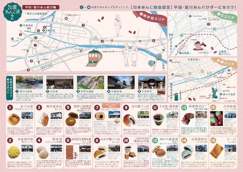 「出雲あんこ旅」とは、島根県出雲市内の和菓子店や洋菓子店、製パン店、飲食店などのご当地あんこスイーツを巡るスタンプラリーイベントです。昨年に続き第2回目の開催となります。昨年は出雲市内でも平田地区に限定した開催でしたが、今回は平田地区と斐川地区にエリアを拡張して行います。「出雲あんこ旅2 ~平田・斐川あん結び編~」として、全16種のあんこスイーツを巡るスタンプラリーとなります。出雲菓子協会と平田菓子同業組合が主催、私ども日本あんこ協会が監修のもと、2025年10月1日(水)~11月30日(日)まで開催致します。