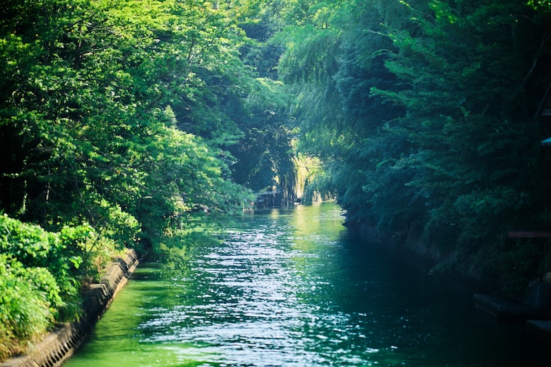 三方五湖ネイチャークルーズの見所の一つ、久々子湖と水月湖を結ぶ「浦見川」は、約360年前の地震による水害対策として人工開削された歴史ある運河です。遊覧船デッキから眺める、間近に迫る岩肌や生い茂る原生林などジャングルさながらの景色は圧巻です。