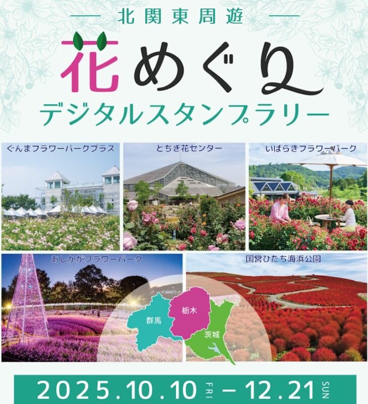 花めぐりスタンプラリーは、北関東に点在する花と緑の観光資源を広く紹介し、施設間をつなぐことで回遊性を高めることを目的としています。2023年から始まった本イベントは、「国営ひたち海浜公園」と「あしかがフラワーパーク」の2施設でスタートし、相互に施設の魅力を発信してきました。その後2024年には「いばらきフラワーパーク」と「とちぎ花センター」が参加。そして今回は「Gunma Flower Park+」が新たに加わり、北関東3県での広域連携が実現しました。本イベントはスマートフォンを活用することで、誰もが気軽に参加でき、訪れる方々が「北関東フラワーパークライン」の魅力を発見していただける仕組みとなっています。