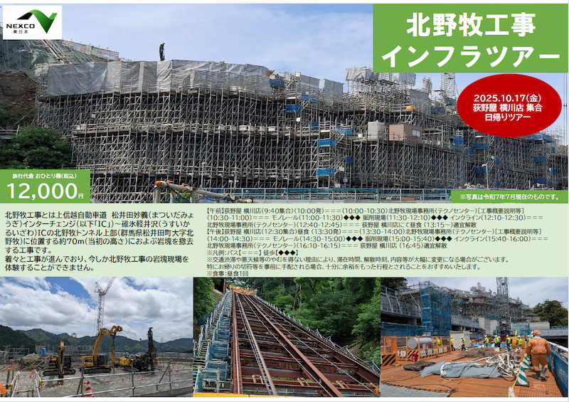| 申込みページ | ・NEXCO東日本HP ドラぷらの旅【群馬県】北野牧工事インフラツアー・午前:https://e-nexcotours.jp/tour/detail?rq_tour_id=10044・午後:https://e-nexcotours.jp/tour/detail?rq_tour_id=10045 |