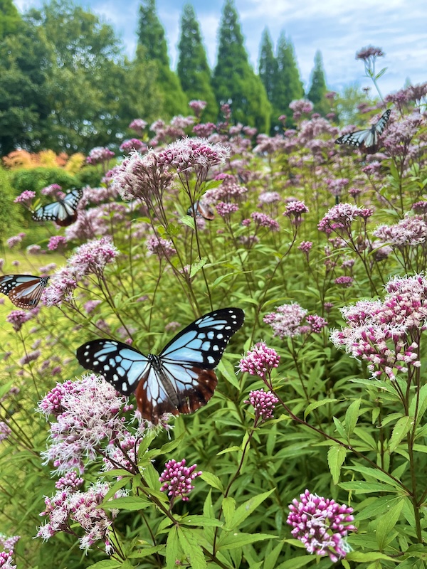 9月30日現在、園内に飛来中です。10月中旬には南方へ姿を消します。クレマチスガーデンには、アサギマダラが好む花「フジバカマ」がありこれを目掛けてピークは数百頭が乱舞します。
