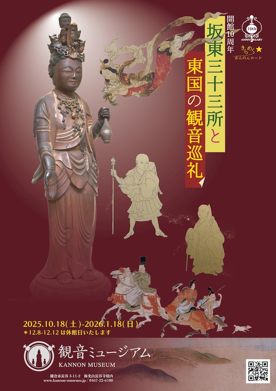今年2025年秋、開館10周年を記念して、長谷寺も名を連ねる「坂東三十三所観音巡礼」の札所寺院各位に特別にご協力をいただき、小特集展を開催するはこびとなりました。各札所の御本尊のお御影(おみえ:御本尊のお姿を描いたお札)をはじめとする貴重な画像を、パネル展示にてご紹介するほか、長谷寺の未公開文化財や、ミュージアムの新収蔵品を公開いたします。