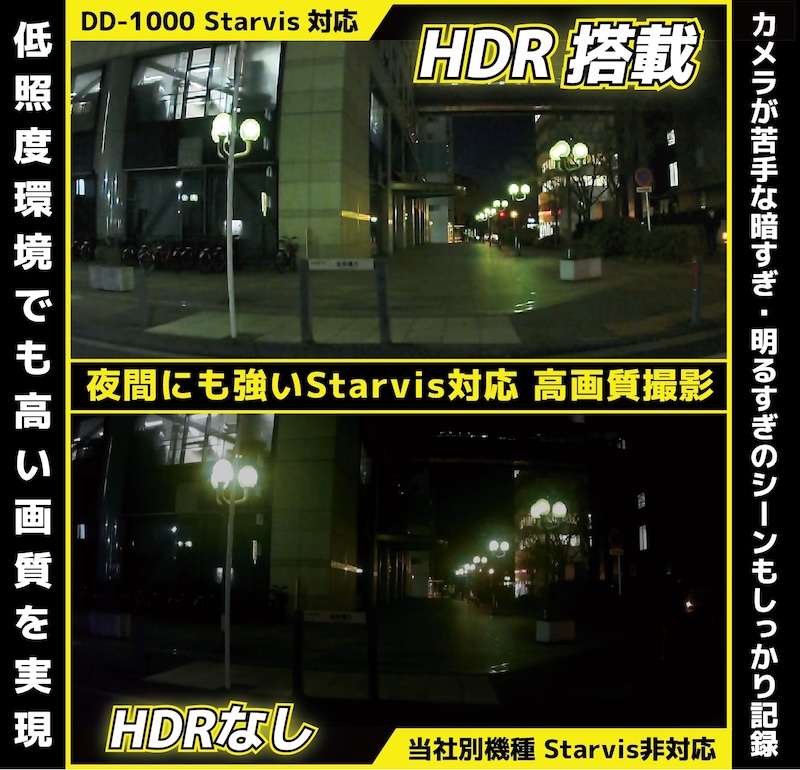 メインカメラには夜間撮影に強いSONY製Starvisセンサーを搭載。光量が少ない環境でもノイズの少ない鮮明な映像を記録します。
