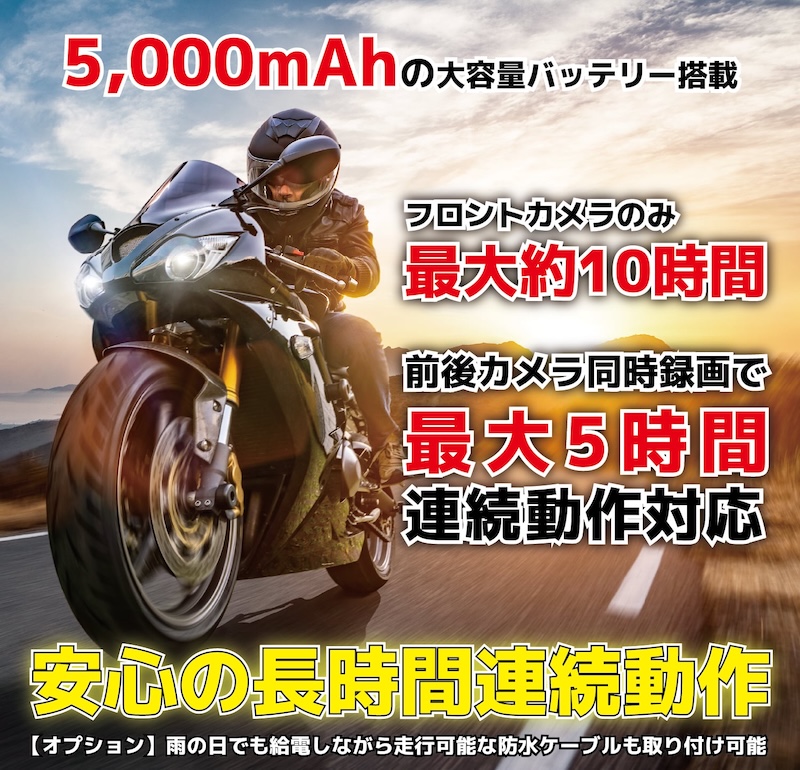 5000mAhの大容量バッテリーを搭載し、前後同時録画でも最長約5時間の連続撮影が可能。安心して長距離のツーリングを楽しめます。※前方カメラ撮影のみの設定では最長約10時間の連続撮影が可能。