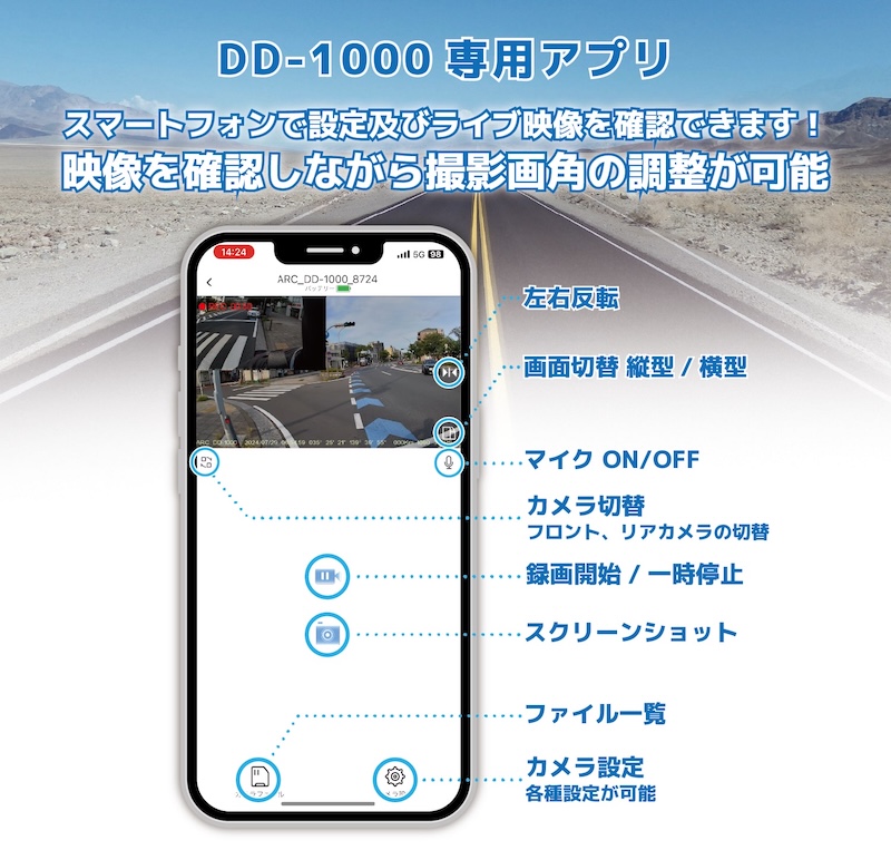 Wi-Fi機能を搭載し、専用アプリを使えばスマートフォンでリアルタイムの映像確認や録画データのダウンロードが簡単に行えます。