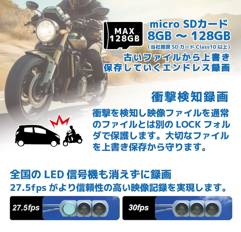 〜 1台で後方のあおり運転も、夜間の低照度な道も鮮明に記録。ライダーの安全を全方位でサポート 〜