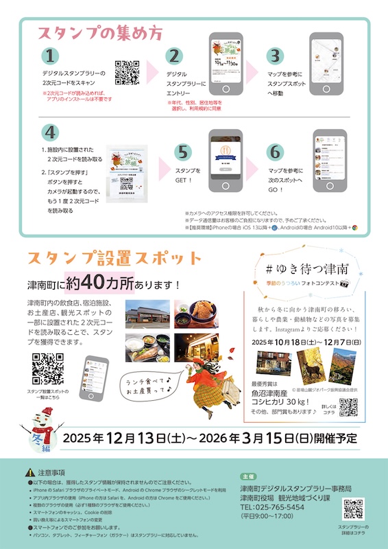 本イベントは参加無料。町内40カ所以上の観光スポットや飲食店などに設置された2次元コードを、スマートフォンで読み取ることでスタンプを獲得できます。スタンプを3個以上集めると、津南の特産品が当たる抽選に応募可能。さらに、スタンプ数に応じて応募口数が増える仕組みとなっています。