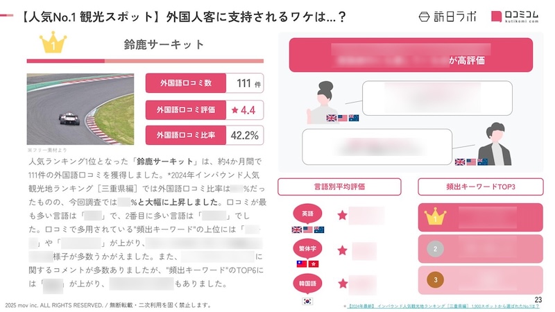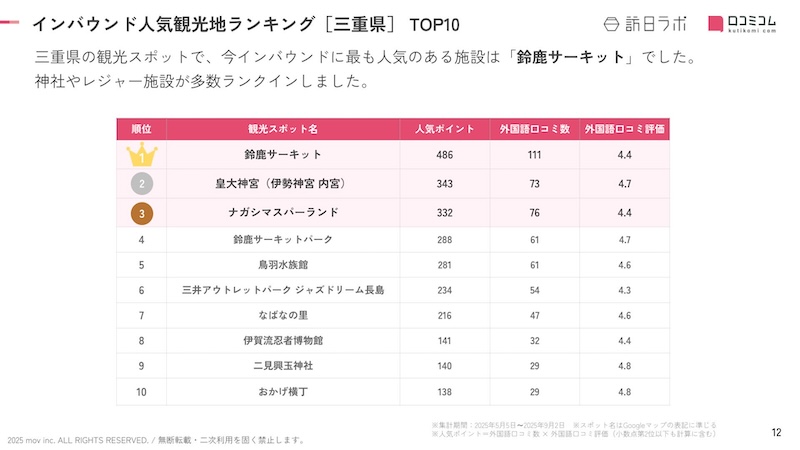 業界最大級のインバウンドビジネスメディア「訪日ラボ」及び 店舗向け集客一元化プラットフォーム「口コミコム」を運営する株式会社movは、三重県の観光地に寄せられた最新の口コミデータから、独自の『インバウンド人気観光地ランキング』を発表しました。
