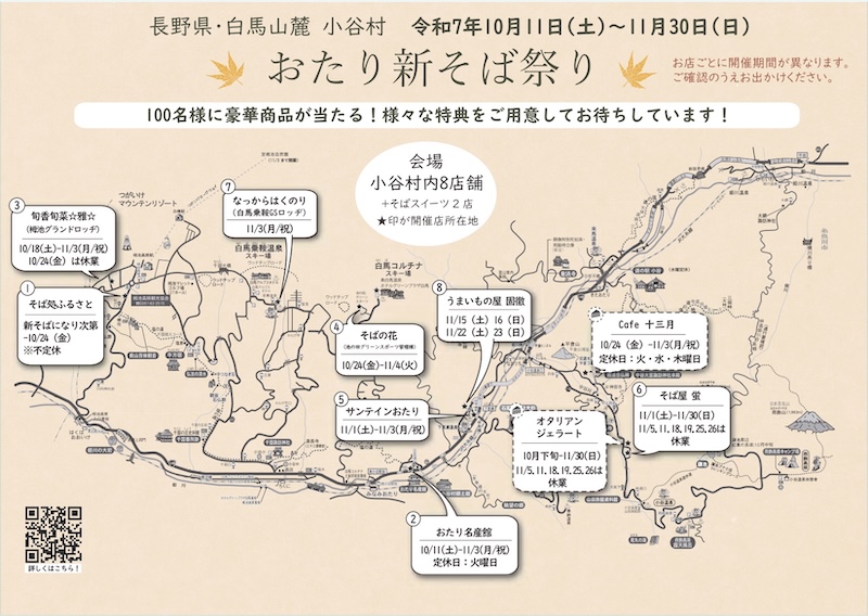 長野県・小谷村(読み:で、2025年10月11日(土)から11月30日(日)まで「おたり新そば祭り」を開催します。村内の各店舗で香り高い新そばやそばスイーツを楽しめるほか、スタンプラリーでは抽選で豪華賞品をご用意。